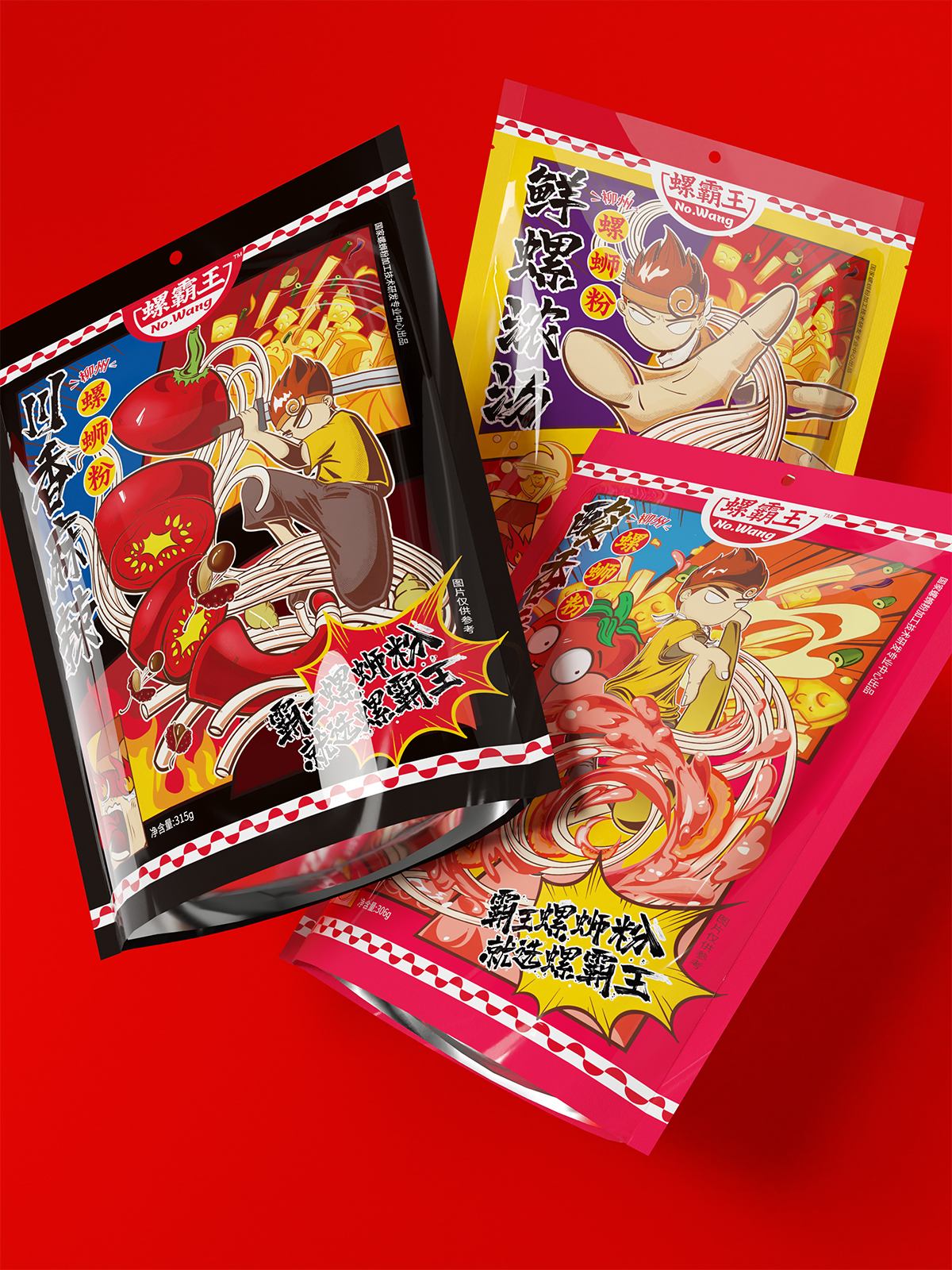 通過尋找消費者心智中的“霸王”文化印記,將螺螄粉的核心材料“螺”融入到人物特征設(shè)計中,構(gòu)建一個年輕人認同的率真、勇敢、張揚的IP形象,彰顯霸王氣質(zhì)。